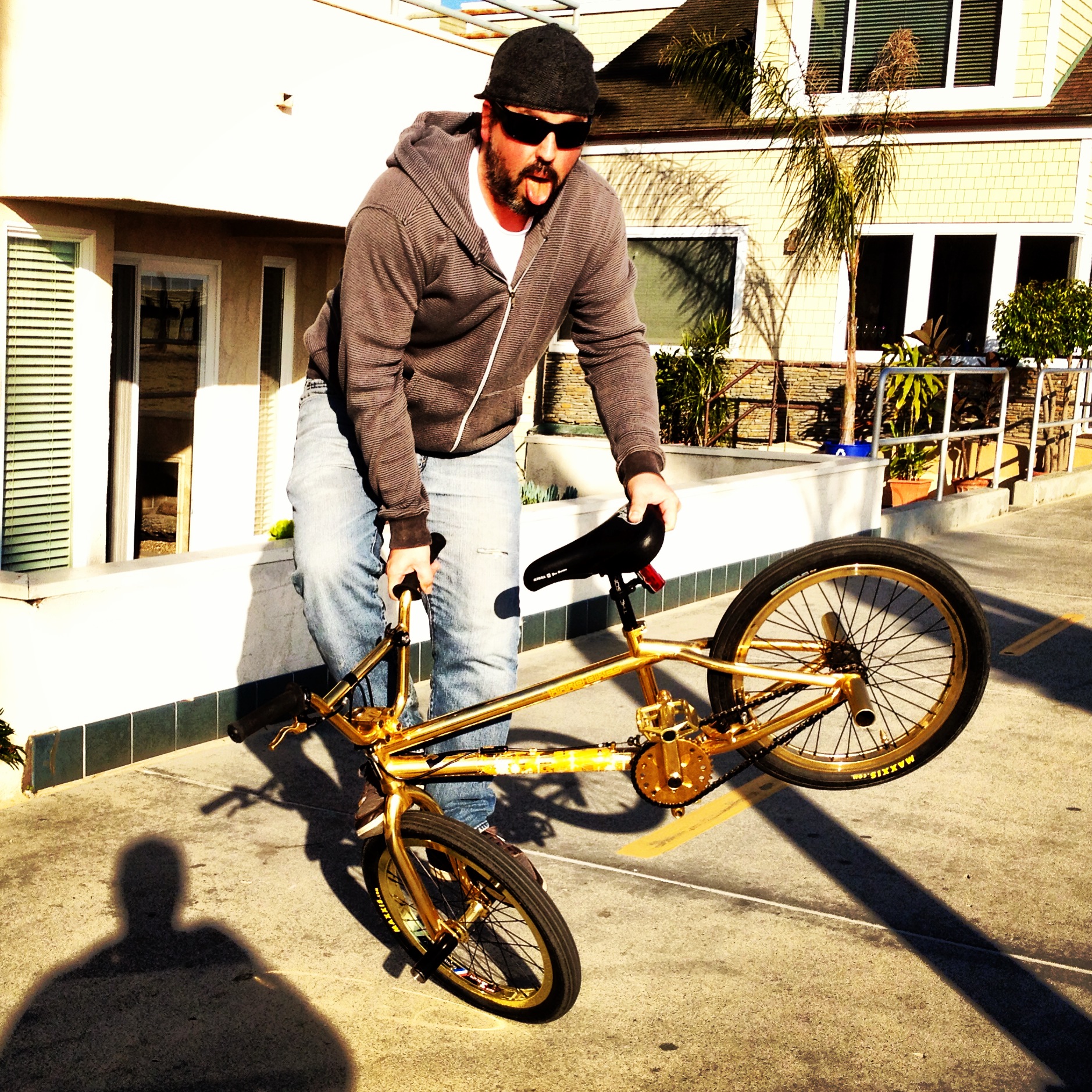 So it’s a clear sunny day out on the Boardwalk in Newport Beach, California. Valentine’s Day to be exact. I was on my LTF looking for a good spot to ride, then out of the corner of my eye I saw a Gold Flash like Full Bling Bike! “Every time I’m in your city Bling Bling, Pinky ring worth about Fiddy, Bling Bling”  I see an OS rider and said,”hey where’d you get that Bike?” I was thinking of the Woody Incident with his Gold Hutch, he got it back, Now I’m thinking Aw Man some one Stole Dave Mirra’s Gold X-Games Bikes, I was gonna Play it cool then Hit up Dave and get him his bike back.