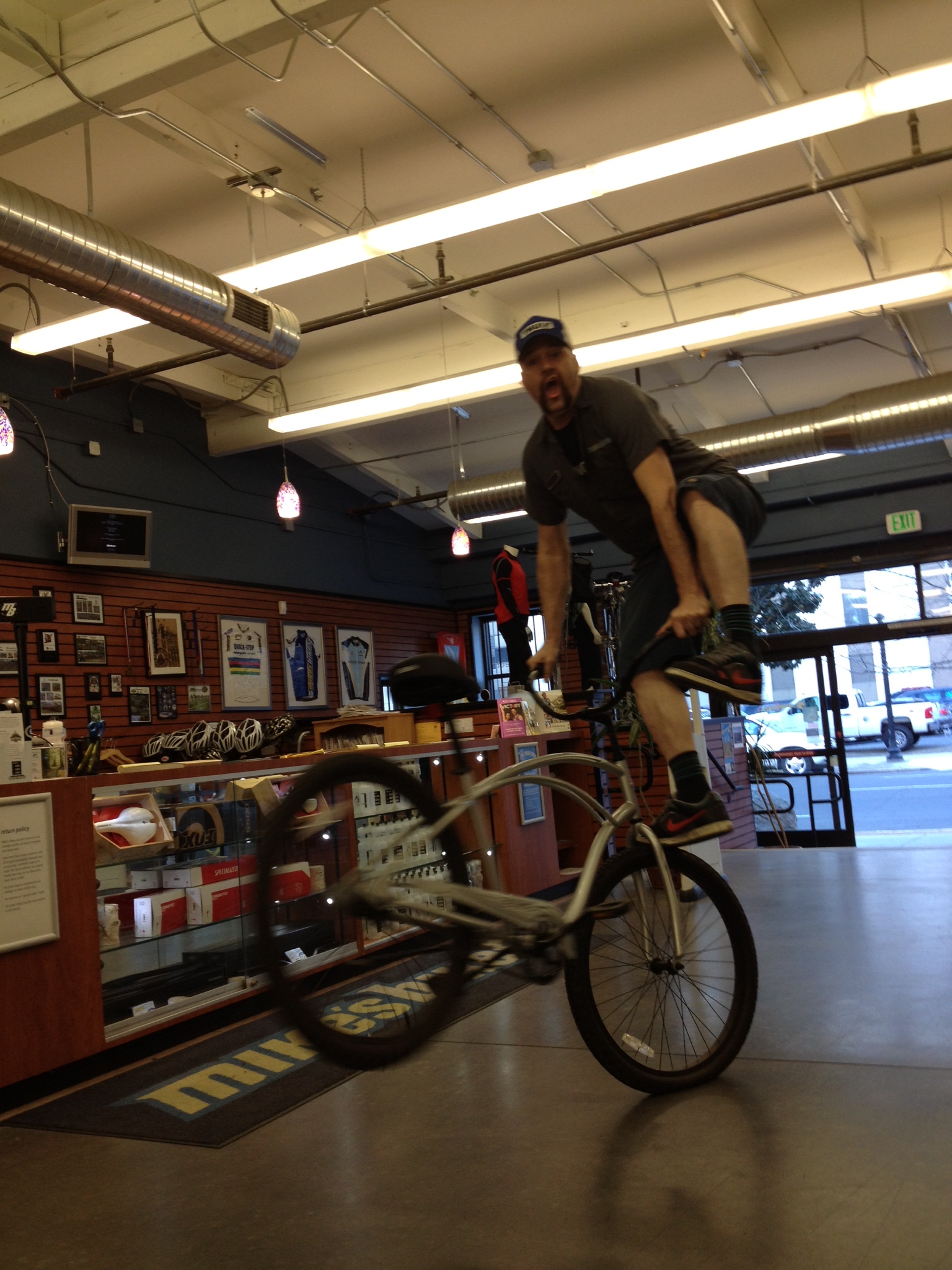 I got a couple of e mails about the wheels did they Taco? come out of true? Spoke blow out on the non drive side? Answer to that is No to all. That Beach Cruiser and Many other Bikes are on Sale and Full on Whip able Just ask For “Thing” at Mikes Bikes. Its on I street stands for I ride. the total Bad part about this story is if you look behind where the back wheel is gonna land on the show room floor there is a plate glass show case. Well after the back wheel came around to full Tail Whip that Glass spider webbed and the sign on it reads “ask the guy in the back how this happened”