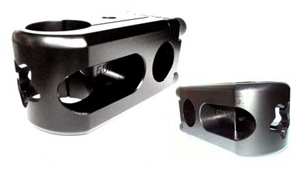CNC machined from 6061-T6 aluminum with a unique clamping system that uses the handle bar clamp to simultaneously clamp the bars and steerer tube. This design eliminates two bolts and produces a knee friendly rounded backside while saving weight at the same time.